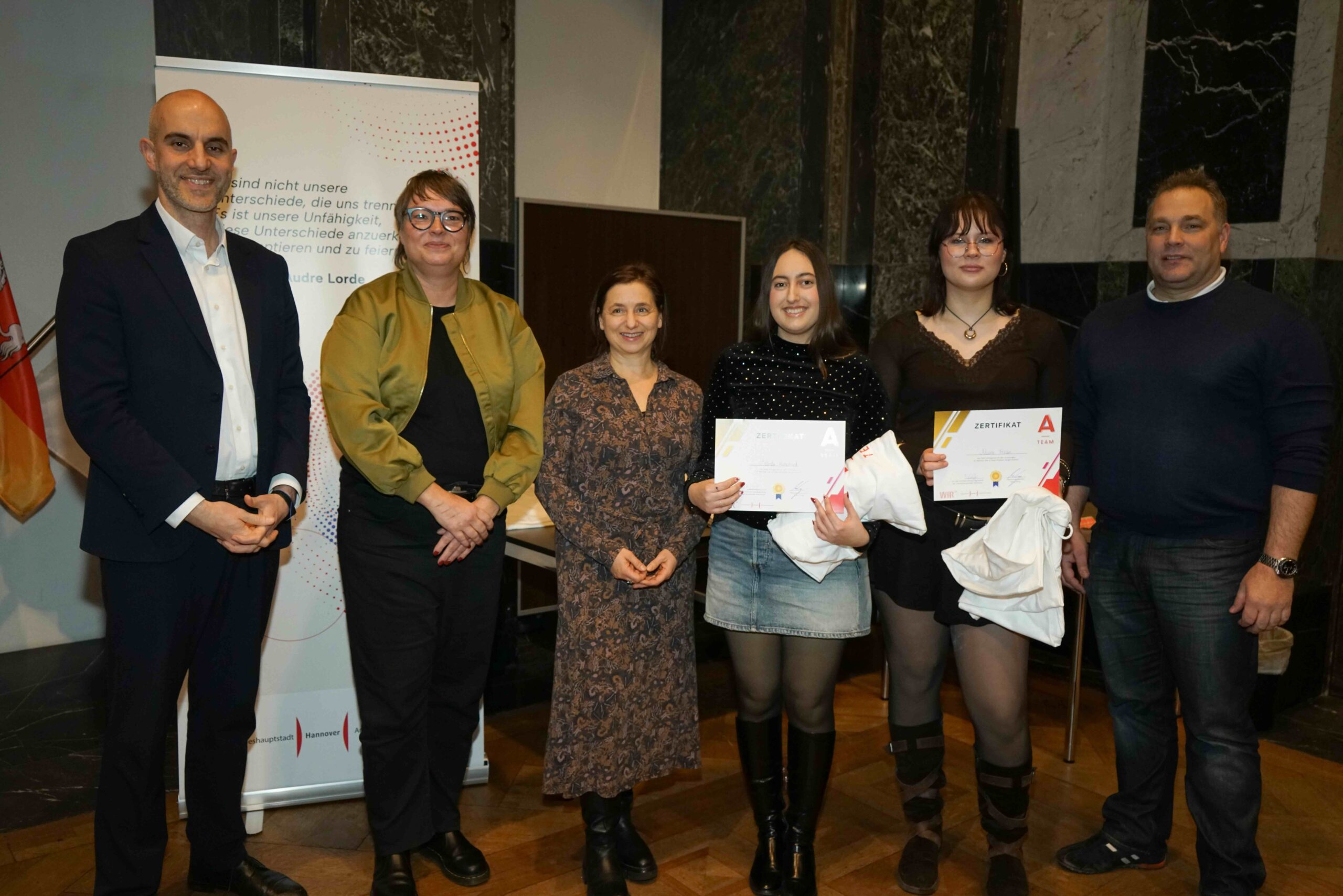 Oberbürgermeister Belit Onay, der die Zertifikatsübergabe zusammen mit Sylvia Bruns, Dezernentin für Soziales und Integration, vornahm, würdigte das Engagement dieser ehrenamtlichen Arbeit: „Die A-Teams leisten einen großen Beitrag, um an Schulen und Hochschulen eine Kultur zu etablieren, bei der Menschen über Diskriminierungserfahrungen sprechen und Betroffene wissen, wem sie sich anvertrauen können.“